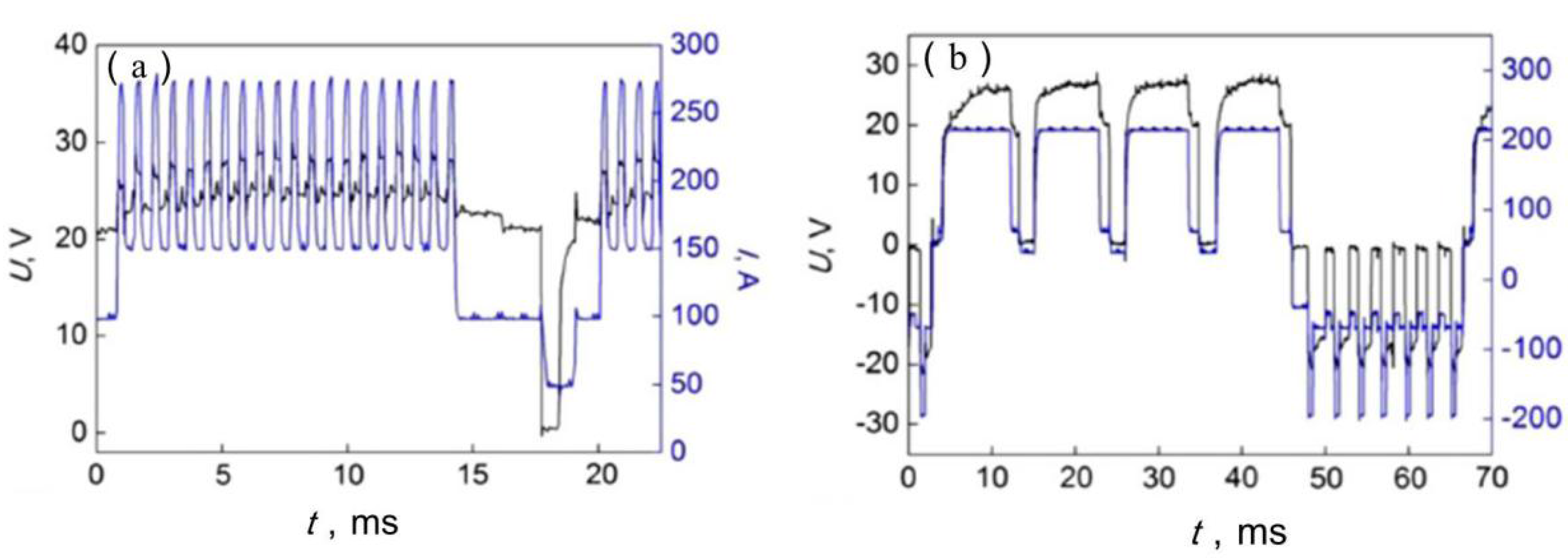 Actual arc current and voltage waveforms of (a) CMT-P and (b) CMT-ADV.