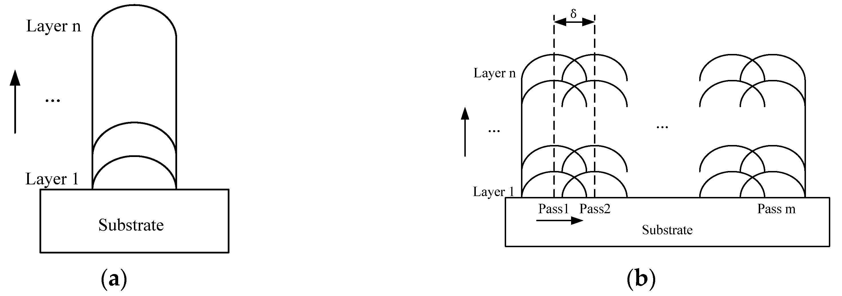 The depositing paths for (a) thin wall samples and (b) block samples.