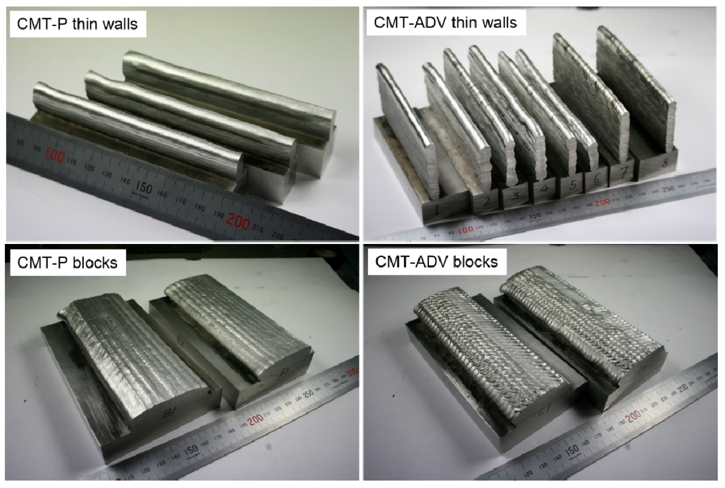 However, all of the abovementioned research projects are based on the thin wall structure. The porosity and microstructure characterization of block structure is not studied. In this paper, thin walls and blocks of WAAM Al-6.3%Cu alloy samples were built with CMT in its pulsed (CMT-P) and advanced (CMT-ADV) variants, respectively. The porosity, microstructure, and micro hardness characteristics for these deposits were investigated in detail.