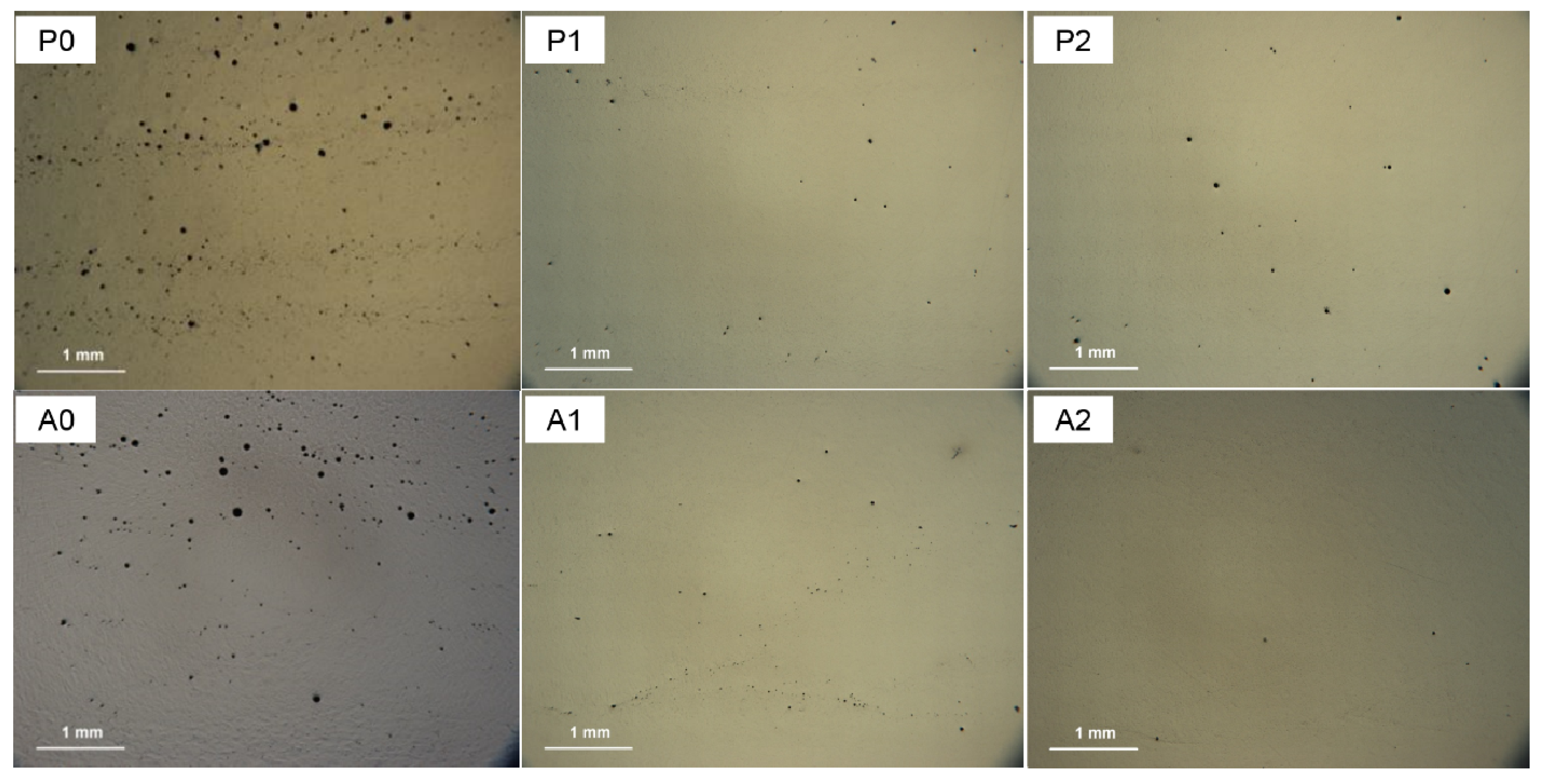 Optically observed porosity for the WAAM 2319 aluminum alloys: P0–P2 were produced by CMT-P; A0–A2 were produced by CMT-ADV.