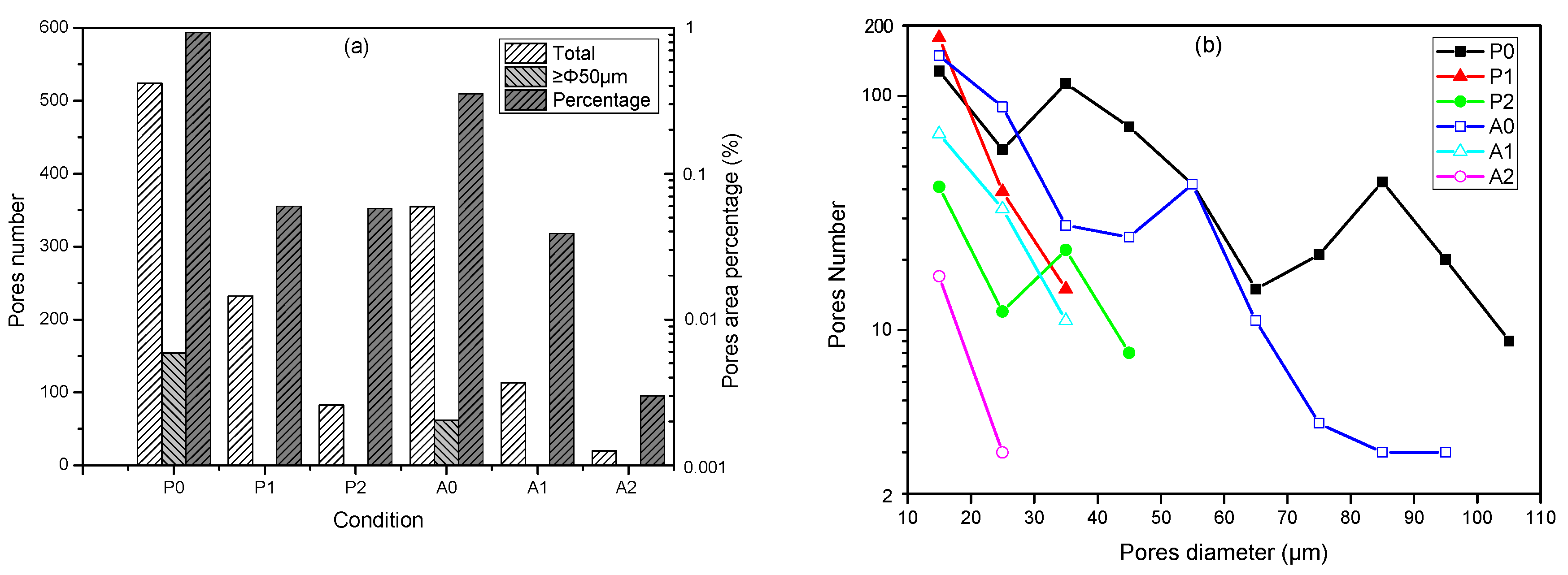 Characteristics of the pore distribution in WAAM 2319 aluminum alloys. (a) Number of pores and area percentage; (b) Number of pores in varied size.