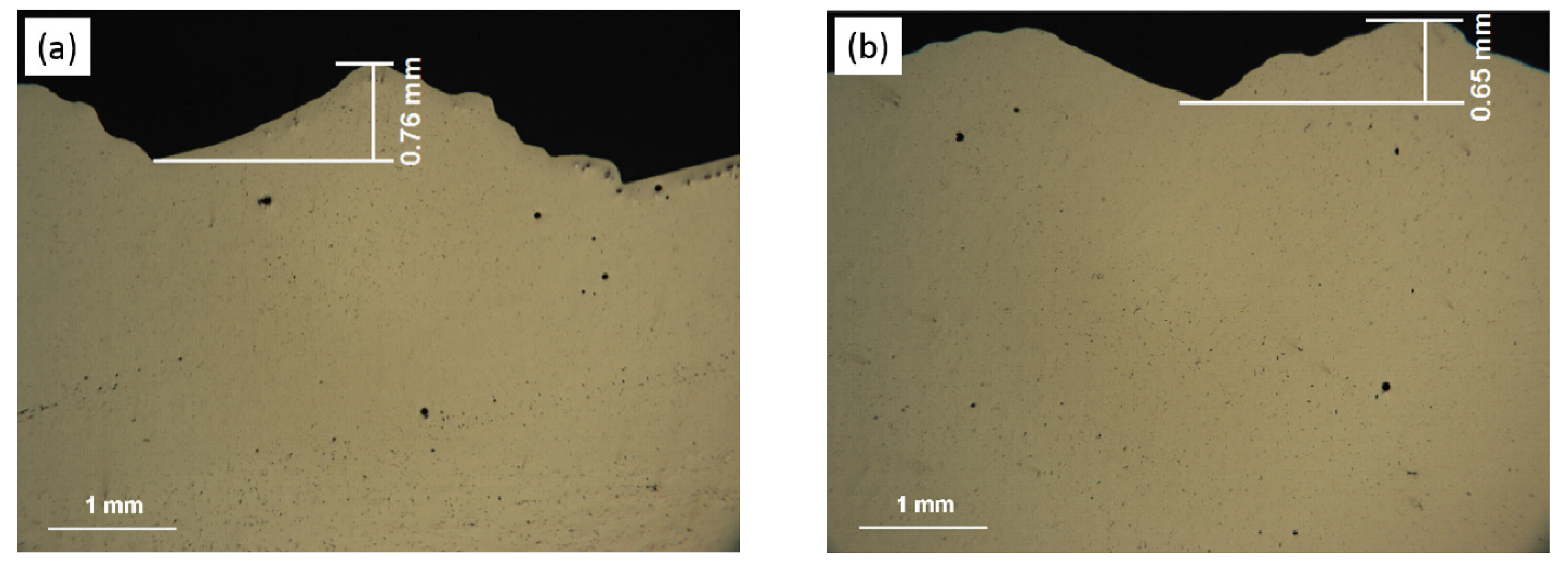 However, it can be found in Figure 6 and Figure 7 that with 0.5 m/min travel speed (A2), the number of pores is less than that in the sample built with 0.6 m/min travel speed (A1), the heat input of which is lower. The reason for this phenomenon is that the weld beads generated by the CMT-ADV process are rough, and the oxidation film in the bottom of the depositing layer surface cannot be eliminated radically and thus turns into the nucleating particles of hydrogen pores. As shown in Figure 8, the mean distance between the peak and the valley of the depositing layer surface in 30 mm length beads with 0.5 m/min travel speed (0.65 mm) is shorter than the ones with 0.6 m/min travel speed (0.76 mm). Thus, the stability of the droplet transfer with 0.5 m/min travel speed may be better, and the oxidation film is much more easily eliminated thanks to the smoother surface. Therefore, less pores are observed in the sample built with 0.5 m/min travel speed.