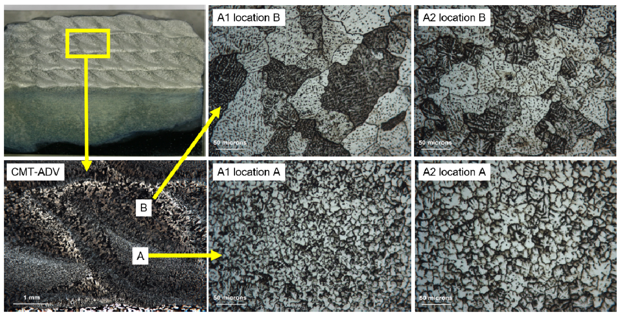 Figure 10 and Figure 11 give the microstructures of block samples built with the CMT–P process and the CMT-ADV process, respectively. It is observed that the microstructure differs even in the same pass. As shown in Figure 10, the microstructure grows from CLZ to NEQZ from the surrounding (location B) to the center (location A) region of every pass in the samples created with the CMT-P process. The samples manufactured by the CMT-ADV process consist of NEQZ and coarse EQZ in sequence along the center (location A) to the surrounding (location B) region, as shown in Figure 11.
