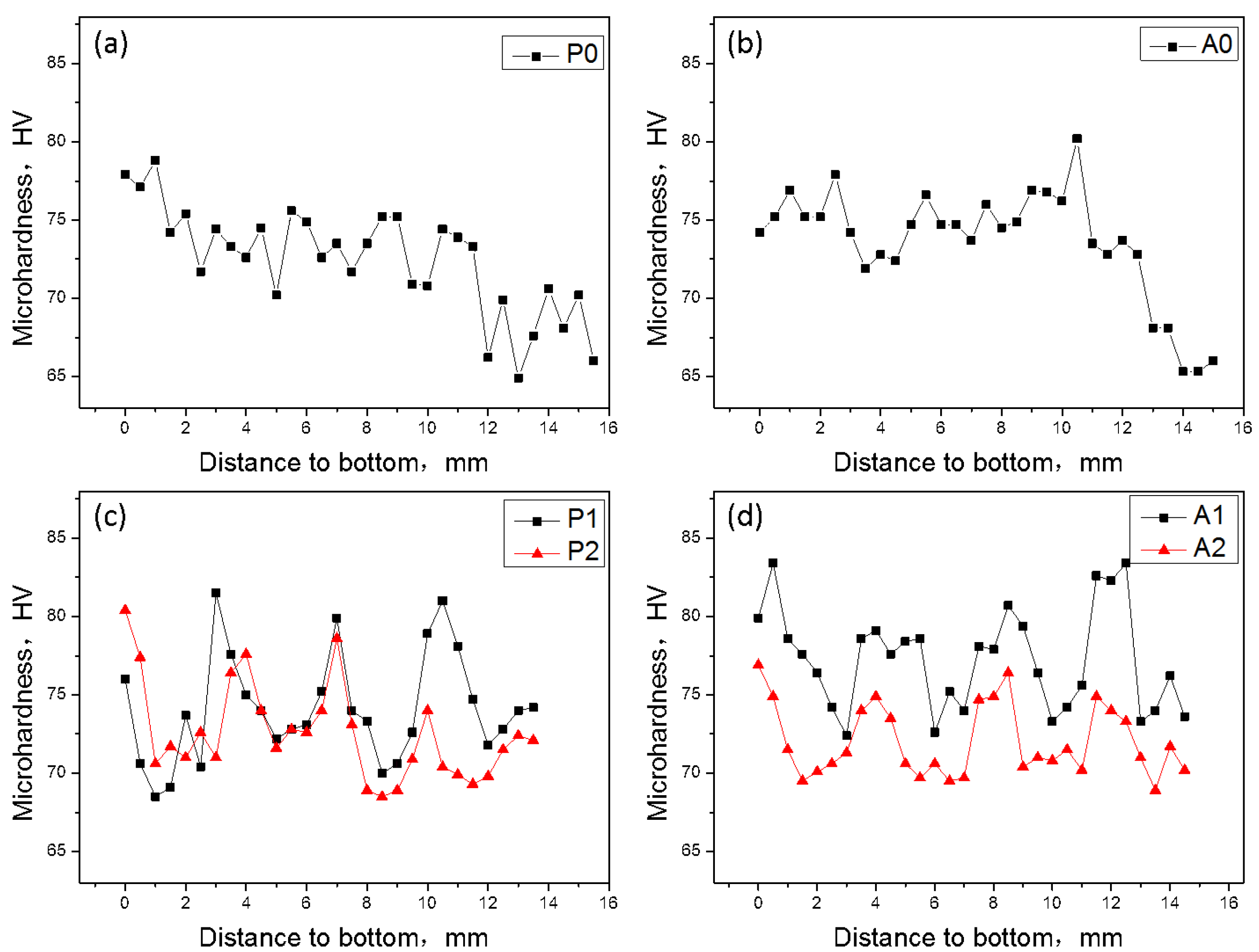 The micro hardness distributions of the WAAM 2319 aluminum alloys. (a) sample P0 = thin wall with CMT-P; (b) sample A0 = thin wall with CMT-ADV; (c) sample P1 (lower heat input) & sample P2 = block with CMT-P; (d) sample A1 (lower heat input) & sample A2 = block with CMT-ADV.