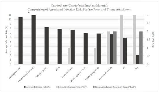 Cranioplasty/craniofacial implant material: comparison of associated infection risk, surface form and tissue attachment. * Indicates implant formation via direct handling of the implant material in surgery; + Indicates implant formation via custom molding template in surgery.
