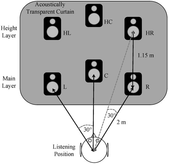 Figure 1 shows the physical setup used for the experiment, which was conducted in the ITU-R BS.1116-compliant listening room [] at the University of Huddersfield. The experiments utilised six Genelec 8040A loudspeakers, which were arranged in two layers, ‘height’ and ‘main’. The main layer consisted of centre (C), left (L) and right (R) loudspeakers, which were each positioned 1.2 m above the ground and 2 m from the listening position. With respect to the listening position, the centre loudspeaker was located at 0° azimuth, with the left and right loudspeakers at ±30°. The height layer comprised the three remaining loudspeakers each positioned 1.15 m directly above a loudspeaker in the main layer: Height Left (HL), Height Right (HR) and Height Centre (HC). With respect to the listening position, the main layer was not elevated, whilst the height layer was elevated by 30°. Appropriate time and level alignment was applied to the main layer with respect to the height layer to accommodate for the difference in distance between the loudspeakers in each layer and the listening position. An acoustically-transparent curtain was positioned between the listening position and the loudspeakers in order to obscure the nature of the test setup from subjects. The ear height of subjects was aligned to the centre point between the woofer and tweeter on the main layer of loudspeakers using a height-adjustable chair.