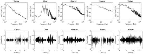 The test stimuli used for the experiment were anechoically-recorded guitar, speech, conga, quartet and oboe excerpts (Figure 2). These stimuli were chosen primarily due to their variations in spectral content. The predominant energy of the oboe source, for example, was in the range of 600 Hz–2 kHz, with notable peaks around 700 Hz and 1.5 kHz, whilst that for the conga ranged from 150 to 500 Hz. Given that in [] it was reported that the localisation thresholds for low frequency octave bands were significantly higher compared to those for the mid-high frequency bands, it was thought that these two sources in particular would be beneficial in analysing the source dependency of localisation thresholds for natural sound sources. The speech source was chosen due to its broadband nature. It was reasoned that if a source dependency could be identified based on frequency then the inclusion of a wideband source would potentially make it possible to identify the frequency region that is more dominant when determining the localisation threshold for broadband sources. The guitar and quartet sources were chosen due to their varying balance between low and high frequency content, which was greater for the quartet compared to the guitar (although both were more dominant in the region below 1 kHz). This again was due to the aim of analysing whether or not the frequency dependency of localisation thresholds could translate to complex sound sources. It should also be noted that the sources contained a varied blend of continuous and transient characteristics, as can be seen in Figure 2, although it has not yet been reported in the literature how this would affect the localisation threshold.