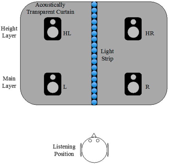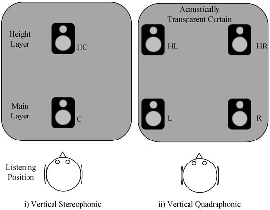 - Vertical quadraphonic: stimulus presentation from the L, R (main layer), HL and HR (height layer) loudspeakers.