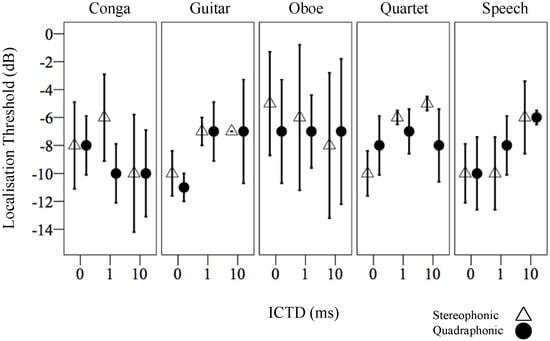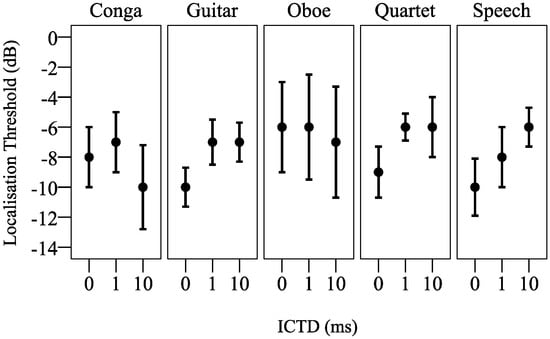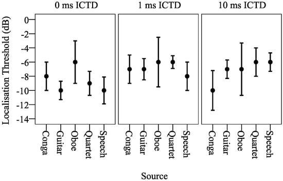 As it was identified that the effect of stimulus presentation on the localisation threshold was not significant, the results for stereophonic and quadraphonic presentation were combined. Figure 5 shows the effect of ICTD on the localisation thresholds obtained, with combined results for stimulus presentation. As before, the median localisation thresholds have been plotted with notch edges. Consideration of the notch edges suggests that the effect of ICTD on the localisation threshold was significant for at least some of the sound sources. The median threshold for the guitar, for example, looks significantly lower for 0 ms (−10 dB) than for 1 and 10 ms (−7.5 dB). Equally, the quartet at 0 ms (−9.5 dB) looks significantly lower than for 1 ms (−6 dB). Friedman tests (critical p value = 0.05) showed that the effect of ICTD was significant for the guitar (p = 0.002), speech (p = 0.021) and quartet (p = 0.005). The effect was not significant for the oboe (p = 0.418) and conga (p = 0.788). A Wilcoxon test was subsequently conducted for the guitar, speech and quartet sources, with the Bonferroni correction being applied to reduce type-I errors []. The results showed the following: For the guitar, significant differences were identified between the 0-ms ICTD and both the 1-ms (p = 0.015) and 10-ms (p = 0.027) ICTDs. For speech, there were significant differences between the 10 ms ICTD and both the 0 ms (p = 0.012) and 1 ms (p = 0.024) ICTDs. For the quartet, the 0-ms and 10-ms (p = 0.015) ICTDs were significantly different from one another. These results generally agree with the notch edges shown in Figure 5, although there are some small differences. It can therefore be concluded that the effect of ICTD on localisation threshold was significant.