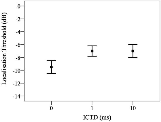 The results of the present experiment suggest that the only variable that had a significant effect on the localisation threshold was ICTD, with delays of both 1 and 10 ms requiring significantly less level reduction than did 0 ms. However, there was no condition whereby ICTD alone was sufficient for the localisation threshold; ICLD was always necessary. This result indicates that the precedence effect, in which an ICTD greater than 1.1 ms between coherent loudspeakers located on the horizontal plane will cause the resultant sound source to be localised at the exact position of the earlier loudspeaker [], is not a feature of median plane localisation. This agrees with the conclusions reported in [,,,]. What is suggested, however, is somewhat of a localisation dominance effect, whereby the presence of an ICTD biases localisation towards the earlier loudspeaker. This can be considered as being similar to summing localisation [] and has been shown to operate in numerous median plane localisation studies [,,]. If it is the case that the earlier loudspeaker becomes dominant in determining perceived source location in the median plane, then this might explain why significantly less ICLD was necessary to meet the localisation threshold for the 1 and 10 ms ICTDs compared to for the 0 ms condition. It should be noted, however, that higher localisation thresholds as a result of a localisation dominance effect have not been reported in previous localisation threshold experiments, with both [] and [] reporting that there was no significant difference between the localisation thresholds in the range of 0–10 ms.