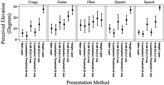 A further result of note can be seen with respect to the main and height layer-only conditions. Firstly, for the latter condition it would appear that perceived elevation judgments were generally accurate for all sources, excluding the oboe, with respect to the physical position of the height layer. Conversely, for the main layer-only condition the judgments were less accurate, with perceived source elevation being in the range of 5.8°–13.0° with respect to the main layer’s physical location. This elevation of the sound source with respect to the main layer was also maintained for the conditions whereby a localisation threshold was applied to the height layer. The results of a Wilcoxon signed rank test, which compared the results for the main layer-only condition to the physical position of the main layer (0°), showed that each source was perceived to be significantly higher than the physical height from which the source was presented (p = 0.000 for all sources).