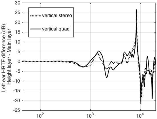Since the primary cue for elevation perception is known to be the spectral filtering of the pinnae in the 4–10 kHz range [], it was first considered how the ear input spectra are affected by the presence of the height layer. In Figure 10, the difference in spectral energy between main and height layer only presentation has been shown for both presentation methods as delta spectra. The head-related impulse responses (HRIRs) used for this exercise were taken from the Massachusetts Institute of Technology (MIT)’s HRIR database created using the KEMAR dummy head microphone []. Any points where the line falls below 0 dB represents dominance of the main layer over the height layer and vice versa. From both delta spectra, it can be seen that the predominant difference in energy between the two layers is a peak (height layer dominant) in the range of 7–9 kHz, a region that is associated with localisation above the subject [,]. It is therefore reasonable to suggest that the increased energy in this region is a key reason that stimuli presented from the height layer only were perceived as being more elevated than those presented from the main layer only in Experiment Two. Since the resultant spectrum for phantom image presentation will depend on the relative strengths of each layer, the following can be suggested. When the ICLD is small, the contribution of each layer to the resultant spectrum will be similar. As a consequence of this, a given source presented as a vertically oriented phantom image will feature more energy in the 7–9 kHz region compared to the same source presented from the main layer only. This will manifest in differences in perceived elevation between the two conditions, as was demonstrated in []. However, as the ICLD increases, the main layer becomes more dominant in determining the resultant ear input spectrum, which means that the differences between the phantom image and main layer only conditions in the 7–9 kHz region would decrease. At the localisation threshold then, this difference is not sufficient enough to be interpreted as an elevation difference and therefore the main layer only and phantom image conditions are perceived as being in the same location. Based on this hypothesis, it can be argued that the primary mechanism used for the subject’s localisation threshold judgment might be the relative spectral energy weighting between the main and height layers in head-related transfer function (HRTF), rather than being related to the fine spectral details of the sound source, which agrees with a previous study conducted by the authors []. It should be noted, however, that the ear input spectra are dependent on the subject and that it is therefore difficult to generalise HRTF characteristics. Based on this, it is apparent that further study is necessary, using measured HRTFs of different subjects, before the importance of the 7–9 kHz region in particular in determining the localisation threshold can be confirmed.