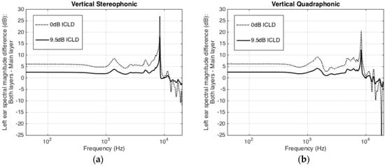 A further aim of the present study was to analyse how the localisation thresholds would be affected by changing the presentation method from vertical stereophonic to vertical quadraphonic, with the results of Experiment One showing that the effect was not significant. In Section 4.1 it was discussed how a key mechanism in determining whether or not the localisation threshold had been met might be the balance of spectral cues provided by the main and height layers respectively. The results of Experiment One would seemingly indicate that this balance was not affected when source presentation changed from vertical stereophonic to vertical quadraphonic. This is apparent when Figure 10 is considered, which shows that the difference in spectral energy between the main and height layer-only conditions were somewhat similar for both presentation methods. In order to gain further objective insights into this result, the influence of the height layer on the frequency spectrum of the ear-input signal was analysed for each presentation method. For this, the spectral magnitude of the ear-input signal resulting from the main layer only was subtracted from that from both the main and height layers, using the MIT’s KEMAR HRIR database []. Figure 11 plots the analysis results obtained when the ICLD was 0 dB (no height layer level reduction applied) and when the localisation threshold (−9.5 dB) was applied. From the plots, the following can be observed. Firstly, the spectral energy in the 7–9 kHz range for the 0-dB ICLD condition was dominant over that for the main layer-only condition, for both presentation methods, in a manner similar to that hypothesised in Section 4.1. In addition to this, when the localisation threshold was applied for each method, the difference in energy in this region was decreased between 8 and 10 dB, whereas that below this region was about 5 dB or less. This therefore supports the hypothesis that decreases in spectral energy in the 7–9 kHz region will result in the localisation threshold being met, with similar reductions for both presentation methods for a given ICLD likely being the reason for the non-significant effect of presentation method. There is also good agreement with the results of a previous study conducted by the present authors [], which showed that the main layer only and two-layer conditions did not have to have equal energy in the frequency range in which the spectral cues for elevation lie for the localisation threshold to be met.