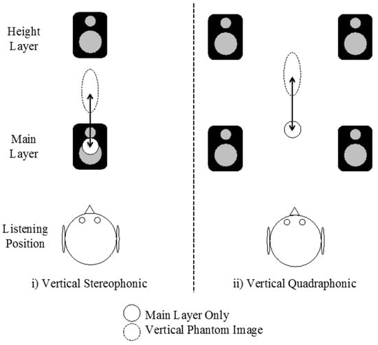 In audio reproduction systems for three-dimensional (3D) sound, such as Auro 3D [] and Dolby Atmos [], the loudspeakers can generally be divided into two layers: the lower (main) layer and the upper (height) layer. In the context of sound recording made using a microphone array in an acoustic space, the frontal loudspeakers of the main layer, which are located on the horizontal plane, are predominantly used for sound source positioning. Conversely, the height layer, which is typically elevated by between 30° and 45°, primarily aims to enhance the perceived listener envelopment (LEV) by presenting ambient signals, although it can also be used to reproduce elevated sound sources. When recording for such formats, it is necessary to pay close attention to the amount of direct sound present in the height layer signal. The reason for this is as follows. Should there be excessive direct sound in the height layer then, at the reproduction stage, sound sources may be perceived as vertically-oriented phantom images at intermediate positions between the main and height loudspeaker layers. Additional spatial and timbral effects may also be perceived, depending on the time and level relationships between the direct sounds in the respective layers. Collectively, these properties comprise an interference effect referred to as ‘vertical interchannel crosstalk’.