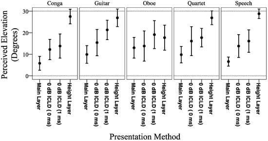 The non-significant effect of presentation method is interesting when the results of previous localisation studies are considered. As shown in [,,], for a single loudspeaker placed in front of the listener in the median plane, the perceived image of broadband noise tends to be localised accurately at the physical position of the loudspeaker. Conversely, the phantom centre image of the noise produced from stereophonic loudspeakers at the ear height (i.e., the main layer of the quadraphonic condition in the current study) would be elevated with respect to the physical position of the loudspeaker as reported in [,,] (this was also observed for natural sound sources in Experiment Two of the present study). Furthermore, a similar degree of difference between real and phantom image conditions in perceived elevation would be observed also for elevated loudspeakers (i.e., the height layers of the current study), based on data presented in [,]. From the above, it can be inferred that, for 0-dB ICLD, sound sources presented using the vertical quadraphonic condition would be elevated with respect to those presented using the vertical stereophonic condition, with the difference in perceived elevation being similar to that for the same sources presented from the main layer only. This would therefore imply that the perceived differences in elevation between the main layer-only and phantom image conditions for a given ICLD would be similar for both presentation methods, as is demonstrated in Figure 12, which would further explain why the effect of presentation method was not significant.