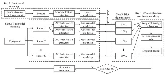 In this paper, a new multi-sensor data fusion method is proposed for fault diagnosis, and the detailed description of the proposed method is shown in Figure 1. One or more attribute features, which can be used for fault diagnosis, can be extracted from each sensor signal. Firstly, in step 1 of Figure 1, Gaussian types of fault models are established using the extracted attribute features from the signal of sensors in each known type of fault equipment. In step 2, Gaussian types of test models are generated as well using the attribute features extracted from sensor signals of the equipment. In step 3, the produced fault models and test models are matched to produce the BPAs. Finally, in step 4, the weighted average approach is used to combine the produced BPAs. Through the decision making rules, the diagnostic results that the equipment is working properly or which type of fault the equipment has is diagnosed. If the equipment has a type of fault, corresponding intervention measures will be implemented.