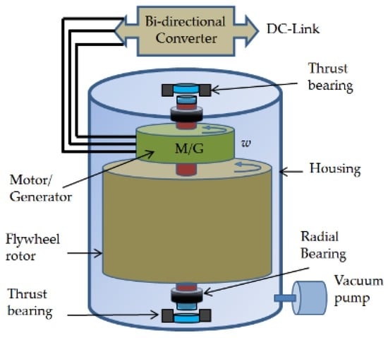 FESS consist of a spinning rotor, MG, bearings, a power electronics interface, and containment or housing, which are discussed in detail in the following subsections. A typical flywheel system suitable for ground-based power is schematically shown in Figure 1.