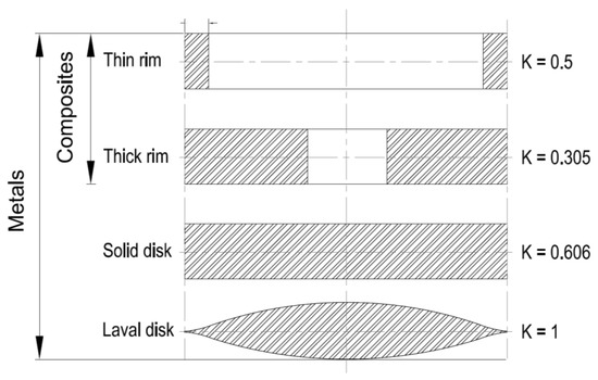 Equations (8) and (9) indicate that the specific energy (energy per mass unit) and energy density (energy per volume unit) of the flywheel are dependent on its shape, expressed as shape factor K. The shape of a flywheel is an important factor for determining the flywheel speed limit, and hence, the maximum energy that can be stored. The shape factor K is a measurement of flywheel material utilisation [18]. Figure 3 shows the values of K for the most common types of flywheel geometries.