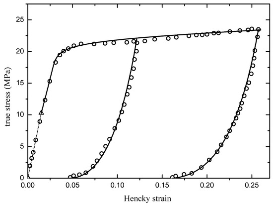 27]. These data (Figure 8) are concerned with a SMP resin sample for the monotone loading case till the strain 23% and then for two unloading cases starting at two strains of 11% and 23%, separately.