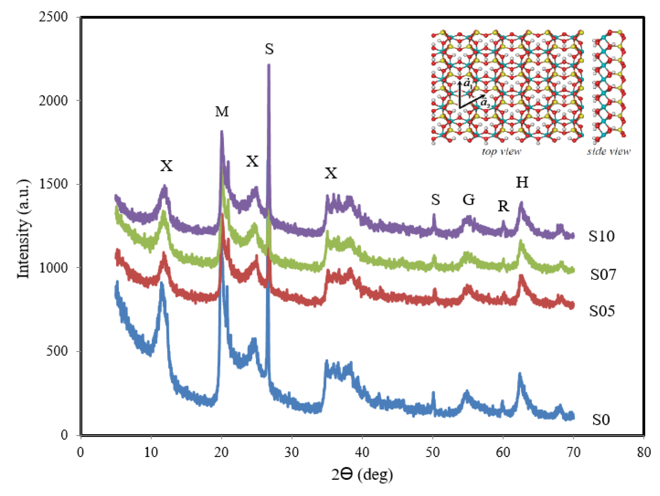 XRD patterns of S0, S05, S07, and S10. X, halloysite (7 Å); M, sodium aluminum silicon oxide; S, quartz; R, silicon oxide; G, graphite.