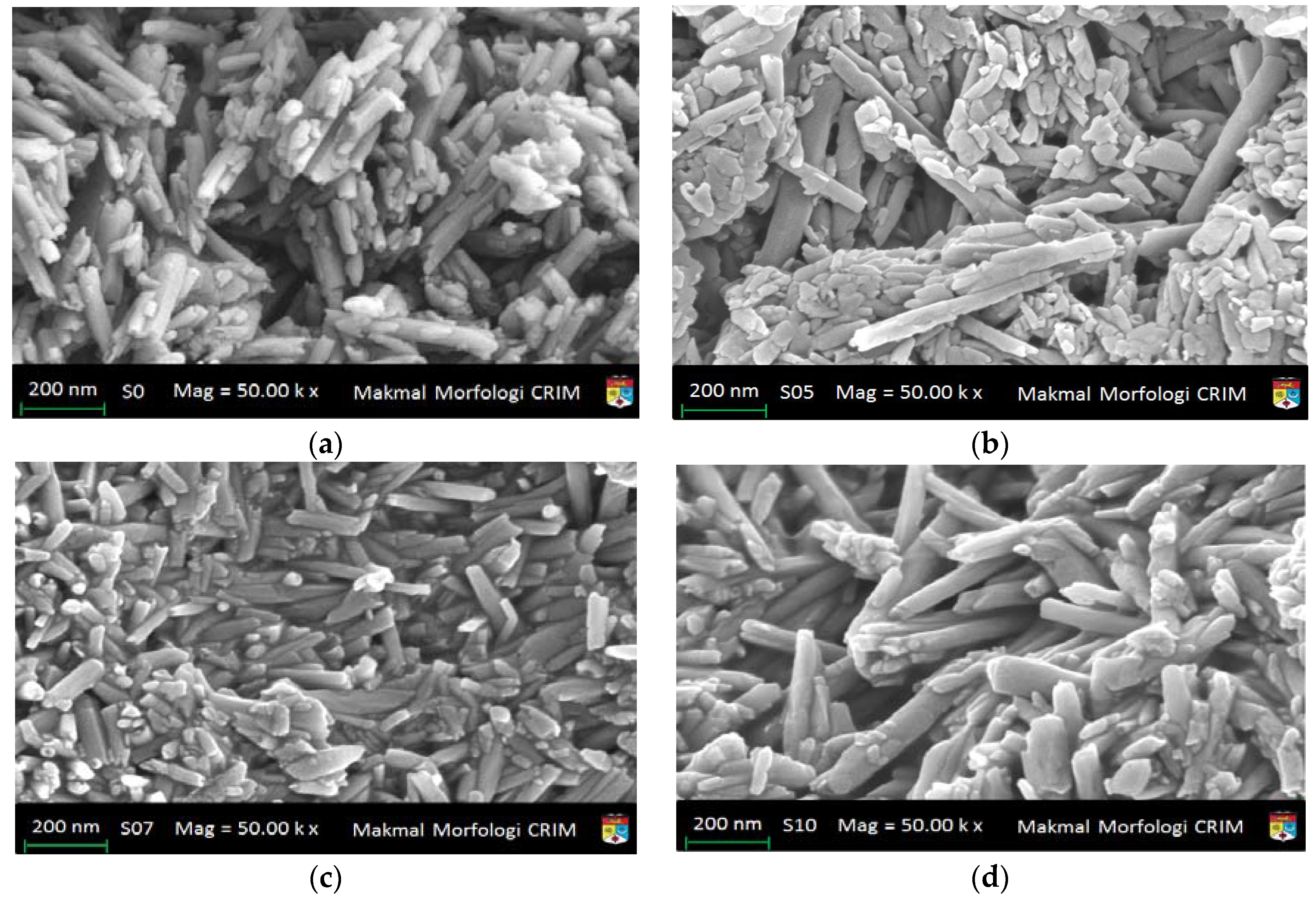 FESEM microphotographs for: (a) S0; (b) S05; (c) S07; and (d) S10.