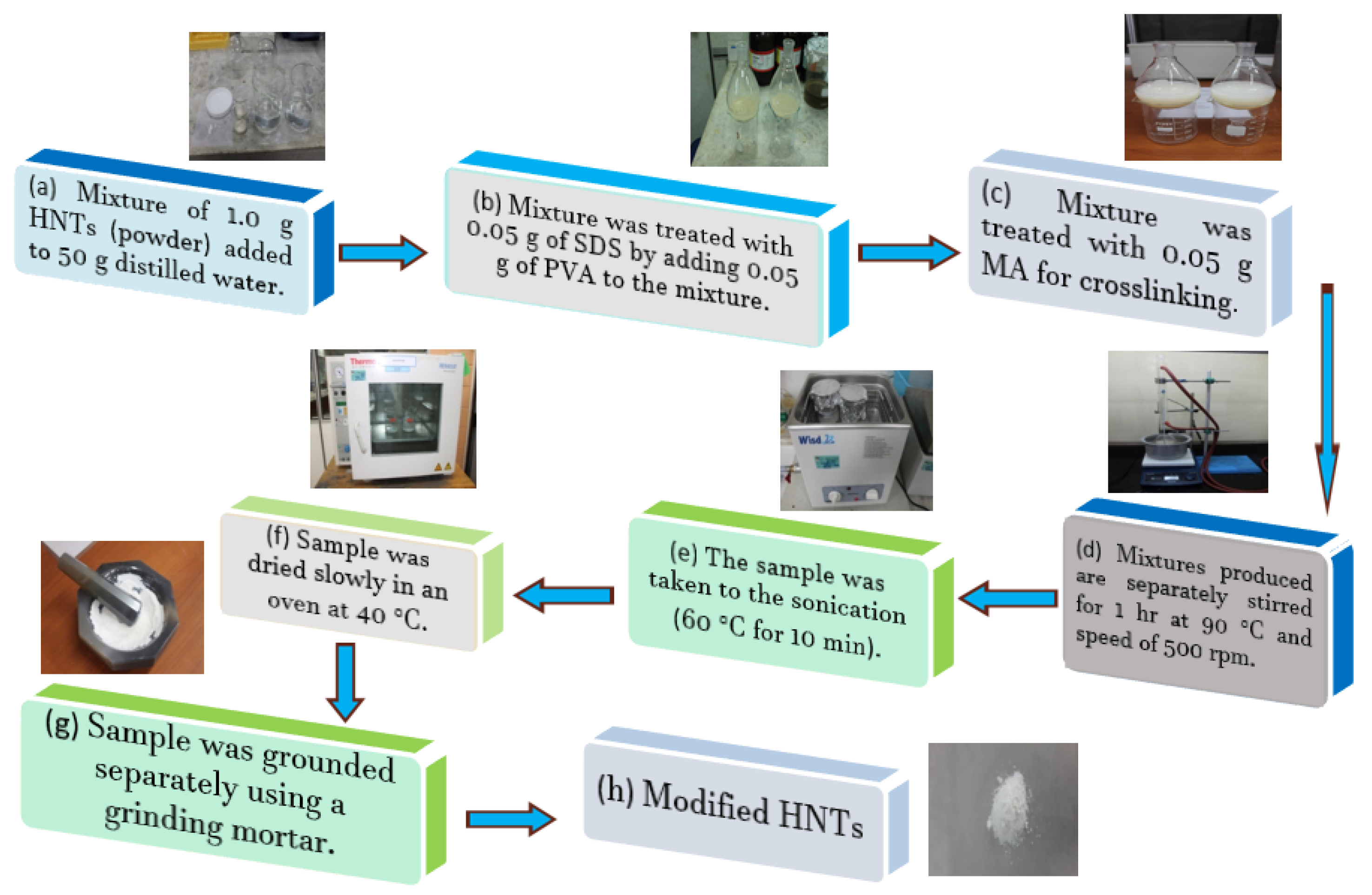 The preparation of the samples was performed throughout four steps as shown in Table 5 and schematically in Figure 4. Firstly, a mixture of 1.0 g HNTs (powder) added to 50 g distilled water at room temperature. The mixture was then treated with 0.05 g of SDS followed by adding 0.05 g of PVA (powder) to the mixture. The final mixture was then treated with 0.05 g MA for crosslinking. For the other two samples, the wt. percentage of 0.07 g and 0.10 g were separately added instead of 0.05 g of SDS, PVA, or MA. The addition of SDS facilitates the dispersion as noted in [16,34]. The mixtures produced in step IV are stirred separately for 1 h at 90 °C at speed of 500 rpm. Then, the samples were taken for sonication at 60 °C for 10 min and are dried slowly in an oven at 40 °C. The three samples are labeled as S05, S07, and S10 based on the wt. percentage of SDS, PVA, or MA, where S refers to sample. The samples are ground separately using a grinding mortar. For completeness, the neat HNTs sample is denoted as S0.