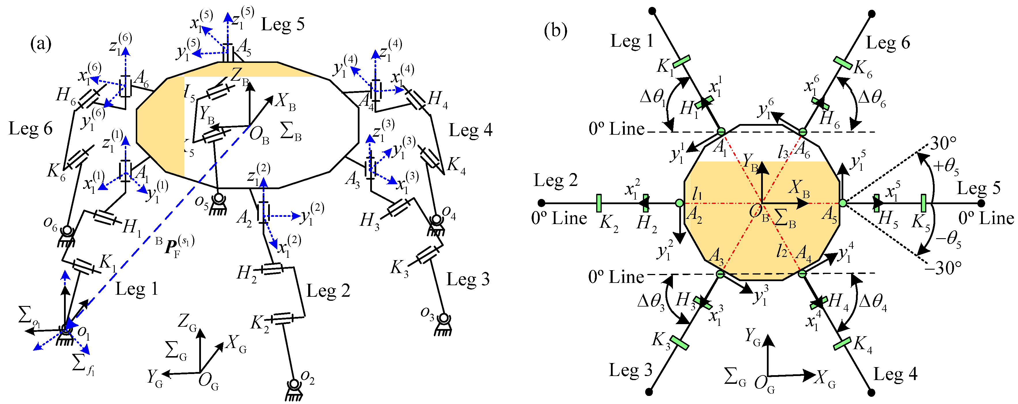 Feet trajectories of leg i in the tripod gait: (a) transfer phase; and (b) support phase.
