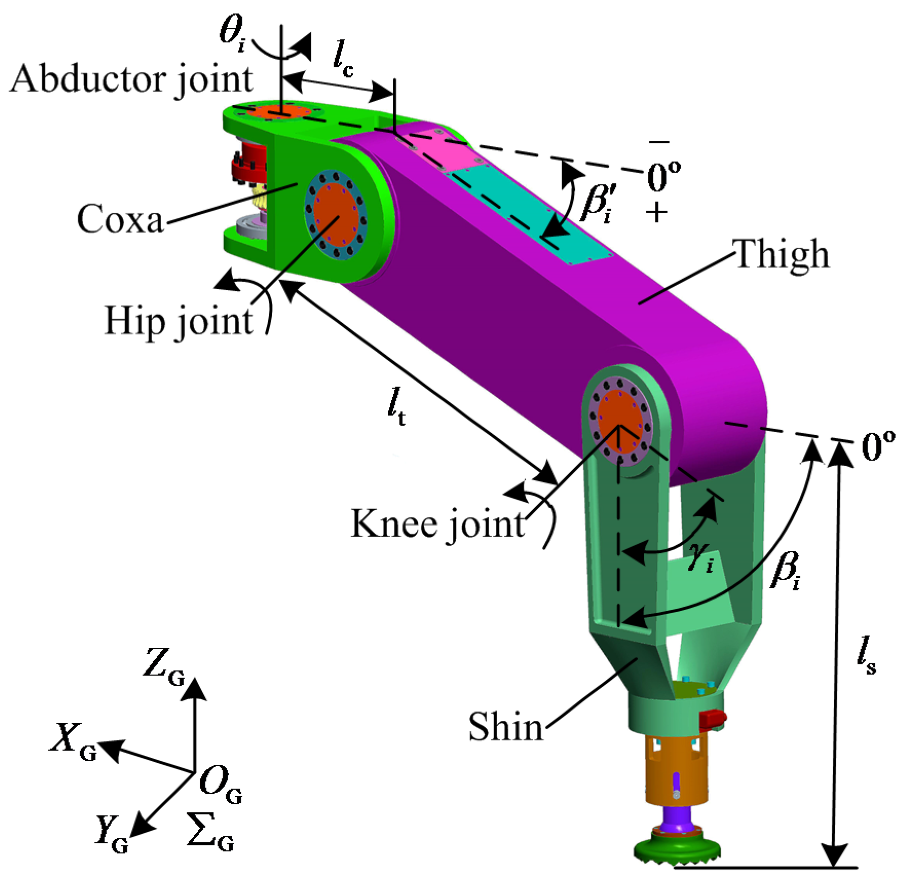 In Figure 1, the 0° lines are kept parallel with the XB-axis of the and pass through the origins of the coordinate systems of the abductor joints. The included angle ∆θi between the 0° line and leg i is defined as the initial angle of the abductor joint. The initial angle ∆θi can be used to set the initial position of the abductor joint when the robot begins to walk. The range of ∆θi is limited from 0° to 60°. θi is the rotation angle of the abductor joint based on the initial angle ∆θi. The initial angles ∆θ2 and ∆θ5 are always zero degrees for legs 2 and 5. The initial angles ∆θ1, ∆θ3, ∆θ4, and ∆θ6 can vary within their range, and they are equal to each other when the robot begins to walk. In Figure 2, the lengths of the coxa, thigh, and shin are set as lc, lt, and ls. The rotation angle of the abductor joint is set as θi. βi′ (i = 1–6) is regarded as the included angle between the coxa of leg i and the thigh of leg i. γi (i = 1–6) is regarded as the included angle between the thigh of leg i and the shin of leg i. The included angle between the coxa of leg i and the shin of leg i is defined as βi (i = 1–6). Then, the relations among βi′, γi, and βi can be obtained; they are βi = βi′ + γi and 0° ≤ βi′ ≤ βi ≤ 90°.