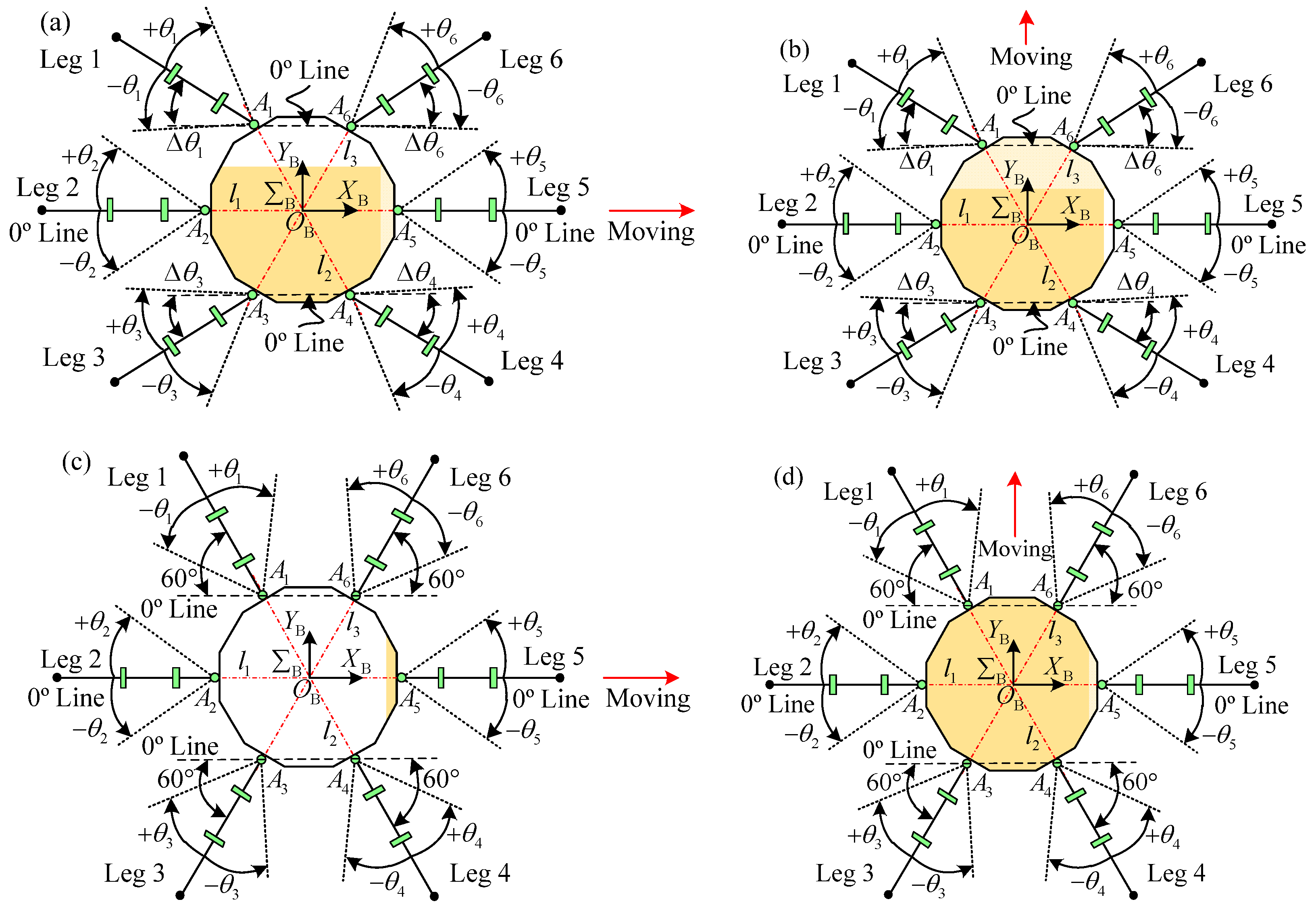 Four kinds of typical walking modes for the large-load-ratio six-legged robot: (a) crab type; (b) ant type; (c) crab–ant mixed type I; and (d) crab–ant mixed type II.