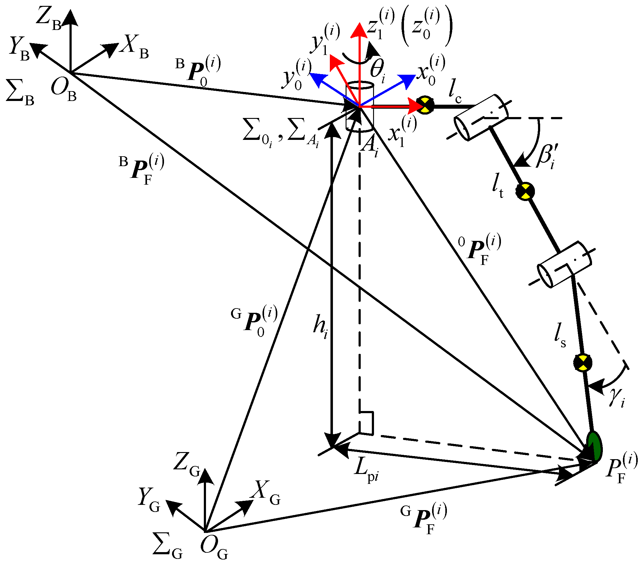 The foot position matrix of leg i can then be written under the coordinate system of the body,