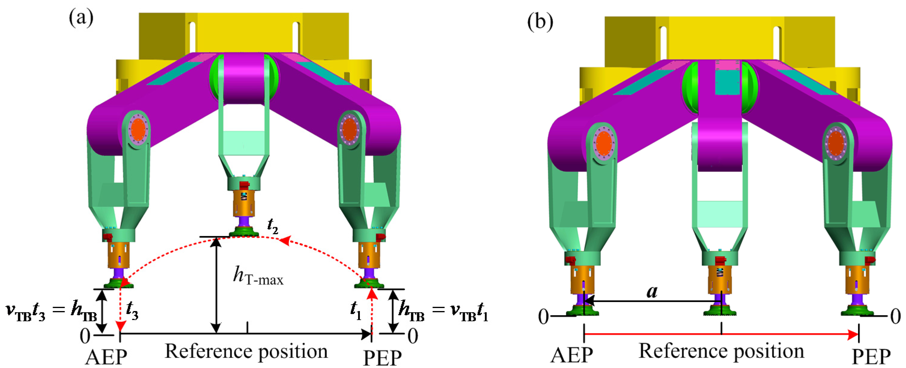The gait planning of multi-legged robots is studied by many researchers. Erden [7] used the free gait generation algorithm to make a six-legged robot generate stable gaits based on the commanded velocity. The reinforcement learning was applied to the six-legged robot in real time. Leblebicioğlu [8] modified the conventional wave gaits. The modified versions of the wave gaits are more efficient than the conventional wave gaits. Ishikawa et al. [9] used a simplified neural network model called the associatron to deal with the gait motion planning problem on an irregular field for a six-legged robot. The viability of the proposed method was verified by the simulation and the experiments of the developed robot. Estremera et al. [10] presented the crab-type turning gaits for hexapod robots on uneven ground and forbidden zones. The turning gaits were tested by the SILO-6 walking robot. Satzinger et al. [11] proposed an end-to-end planning method that can achieve the teleoperated mobility of robot in complex environments. Fielding and Dunlop [12] extended the range of forward walking gaits of robots by adjusting the restrictedness controller. The range of wave gaits was then developed. The test experiment was carried out by a small hexapod “Hamlet”. Tedeschi and Carbone [13,14] addressed the design and operation of hexapod walking robots. The example of gait planning was provided through kinematic and dynamic features of Cassino hexapod leg operation. Sadati et al. [15] developed a motion planning algorithm for walking with passive knees. Although many researchers have performed a lot of research regarding the gait planning of the legged robots and have obtained effective planning strategies, the buffer device located at the shin is rarely considered in the gait planning. At present, we have not found reports in the literature that the initial lift height of the swing leg is introduced into the gait planning for large-load-ratio multi-legged robots.