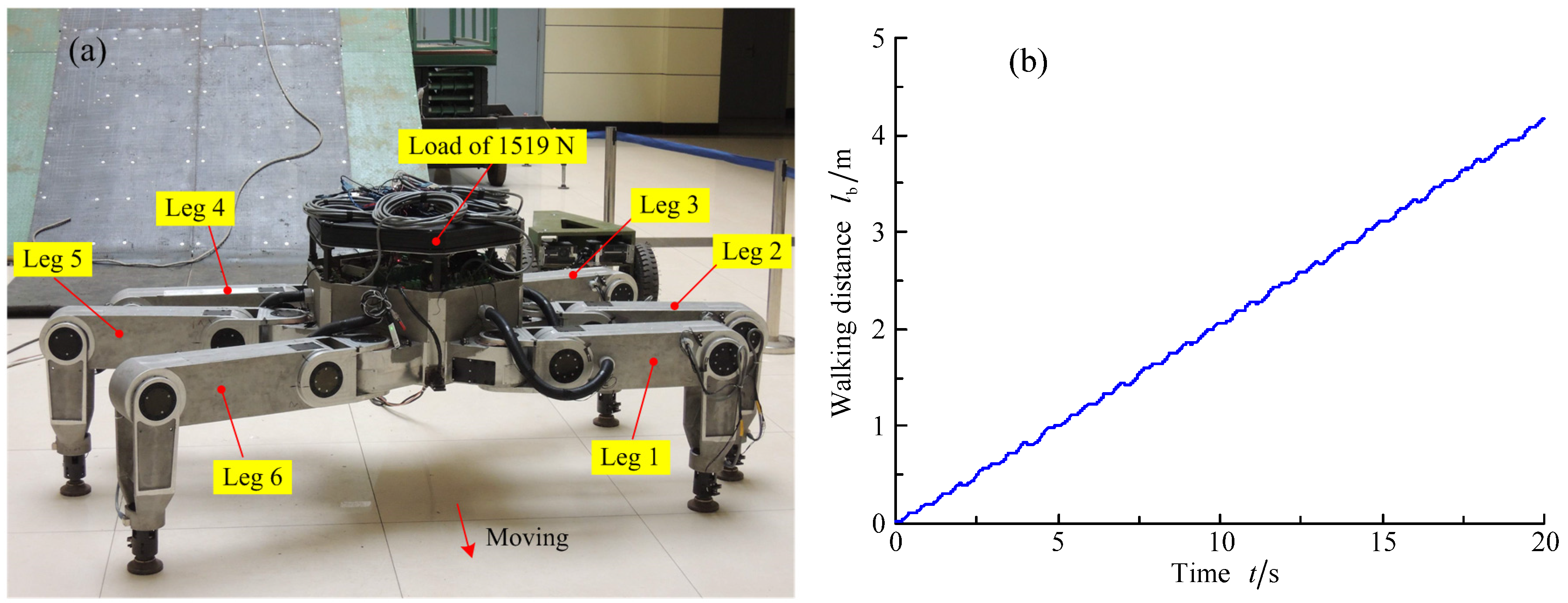 The ant-typed tripod gait is selected for the experiment of walking speed for the large-load-ratio six-legged robot. Then, the body of the robot carries the load of 1519 N. The movement time (TM) is set as 100 ms in the programmable multi-axis controller (PMAC). The support distance of the leg i is set as 0.2 m in the support phase. Hence, the theoretical walking distance should be 2vmaxT/5 for the large-load-ratio six-legged robot in a gait period. The experiment using the walking speed 2vmax/5 under a load of 1519 N is shown in Figure 7. Based on the range sensor installed in the robot body, the walking distance lb of the robot can be obtained with the change of time t. Then, the curve of walking speed is drawn and is shown in Figure 7.