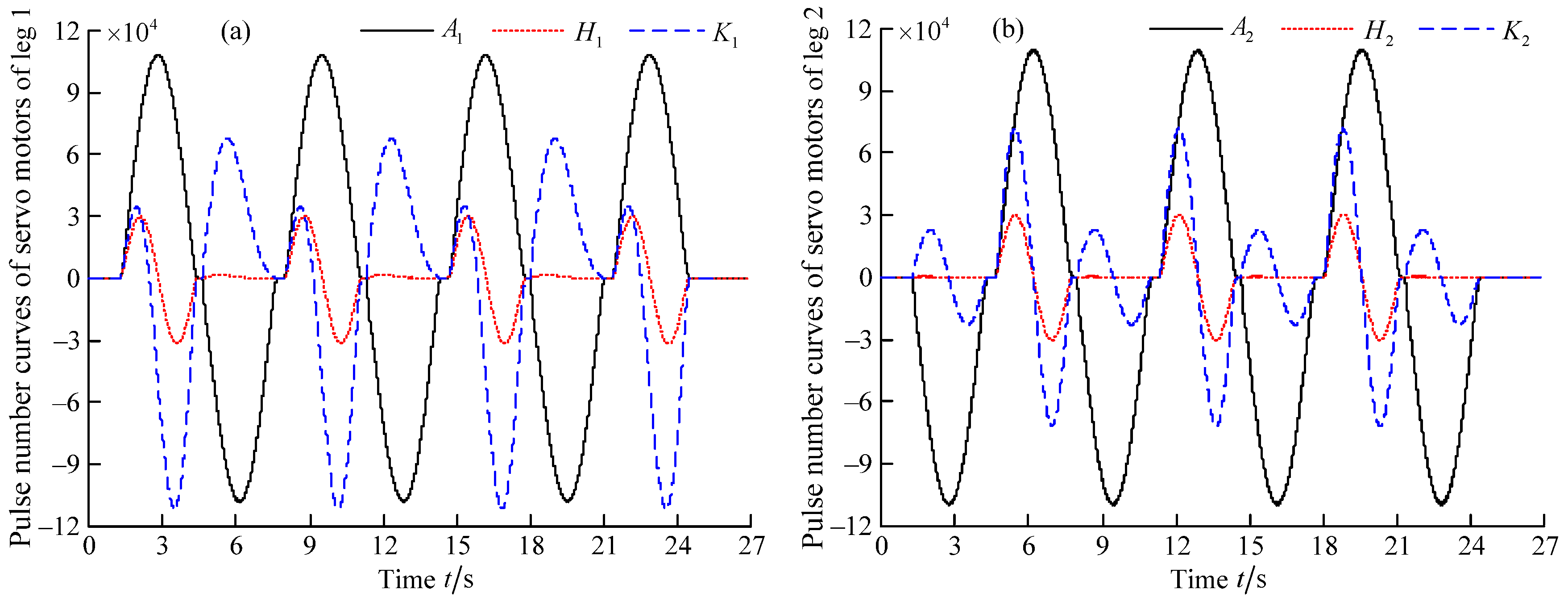 Pulse number curves of servo motors for abductor joints, hip joints, and knee joints: (a) leg 1; and (b) leg 2.