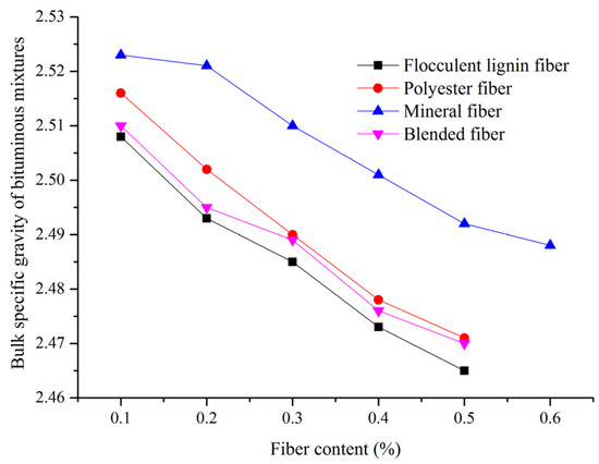 Figure 2 displayed the bulk specific gravity of SMA mixtures with different fibers and fiber contents. The data show an inverse correlation between bulk specific gravity of SMA mixtures and fiber content for fiber types. The SMA mixture with mineral fiber had the largest bulk specific gravity values, followed by the mixture with polyester fiber. The mixture with flocculent lignin fiber had the smallest values. All of the bulk specific gravity values were between 2.465 and 2.523. The bulk specific gravity of SMA mixtures with polyester fiber and blended fiber decreased with fiber content increasing from 0.1% to 0.4%, and then it maintained a slight decrease with fiber content from 0.4% to 0.5%. The mixture with mineral fiber had a similar variety, with the only difference being the relatively smaller reduction in fiber content from 0.5% to 0.6%.