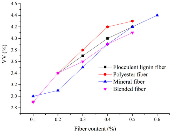 It was found from the results that the polyester fiber had an important impact on the VV values when the content was up to 0.2%. It indicated that polyester fiber prevented the aggregates contacting each other and formed much more space in the mixture due to its higher ductility. The VV with polyester fiber, flocculent lignin fiber, and blended fiber increased with the fiber content increasing from 0.1% to 0.4%, and then it maintained a slight increase with the fiber content from 0.4% to 0.5%, and the increments of flocculent lignin fiber, polyester fiber, and blended fiber were 4.5%, 1.9%, and 4.9%, respectively. However, mineral fiber had little impact on VV values when the content was less than 0.2% due to the negligible impact on the asphalt absorption. However, when the content was more than 0.2%, mineral fiber began to show its effect on absorptive action and the mixture’s adsorption, for which the VV showed a significant increase. At the same content, the mixture with polyester fiber had the largest VV value.