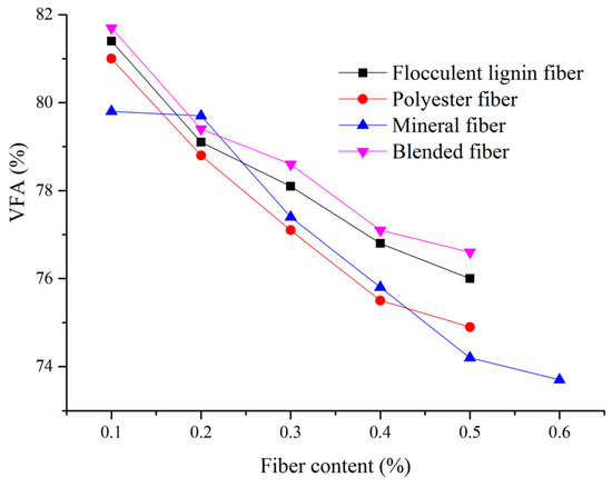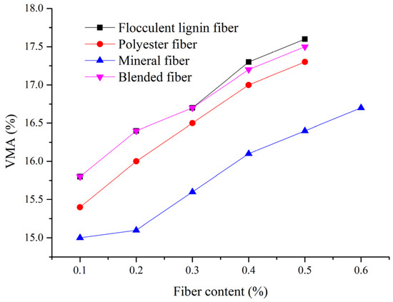 Four different fibers, i.e., flocculent lignin fiber, mineral fiber, polyester fiber, and blended fiber, were selected in order to analyze the effect on VMA at different fiber contents. The blended fiber was made up of flocculent lignin fiber and polyester fiber with mass ratio of 2:1. Some important technical indicators of these fibers are listed in Table 5.