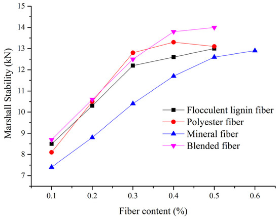 Figure 6 displayed the Marshall Stability of SMA mixtures. It had the similar trend with VV. All of the Marshall Stability values were between 7 and 14 kN. Compared with the previous literature, this was larger than with cellulose oil palm fibers. The data from Figure 6 indicated that fiber types and contents had evident correlations between fiber content and Marshall Stability, which increased with fiber content increasing. When the fiber content was less than 0.3%, the SMA mixture with polyester fiber showed better stability. When the fiber content was larger than 0.3%, the SMA mixture with blended fiber showed better stability than that with the other three fibers.