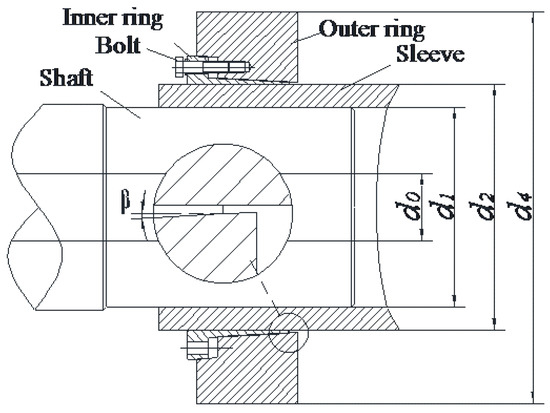 As an important connection of a wind turbine spindle and a gearbox between the planetary frames, the shrink disk of a wind turbine aims to transfer large torque and withstand complex changeable loads. The whole transmission chain of a wind turbine will fail in the event of failure of the shrink disk. Here, the multi-layer interference mainly consists of a shaft, a sleeve, an inner ring and an outer ring. The half conical angle of the mating surface between the inner ring and the outer ring is β = 3°, as shown in Figure 1. The mating surface between the inner ring and the sleeve and that between the sleeve and the shaft are part of the clearance fit before assembly. The interference fit is formed through tightening the bolts, and the movement of the outer ring to inner ring along axial direction generates radial contact pressure. The continuing pressure of the inner ring shrinks the internal diameter of the sleeve; ultimately, the clearance of the mating surface between the shaft and the sleeve is eliminated and the interference fit is finally formed.