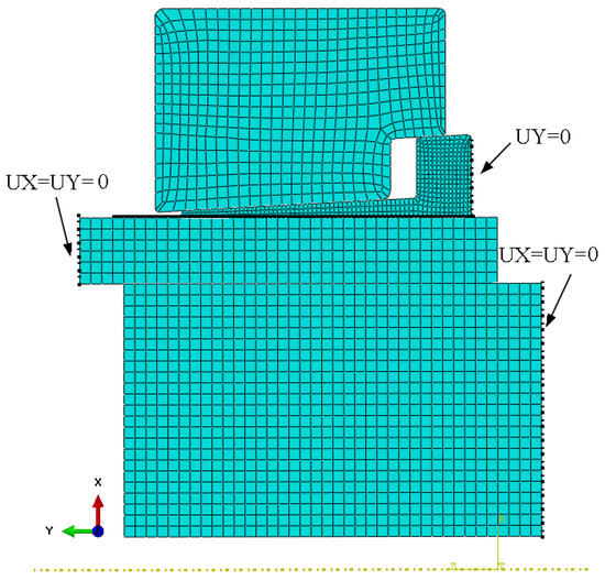 The general information regarding the finite element model based on Table 1 is as follows. Taking into account the geometric symmetry of the turbine shrink disk and the symmetry of the loads on various components, a two-dimensional axisymmetric model is established with FEA software ABAQUS. Four-node asymmetrically reduced integral unit CAX4R and the contact algorithm of penalty function method is adopted in the model [13,14]. The mesh size of shaft, sleeve, inner ring and outer ring is 2, 1, 2 and 2 mm, respectively. The element shape is quad and the algorithm is medial axis algorithm. According to the actual working conditions, the right end of the inner ring is set with an axial constraint; the left end of the sleeve and the right end of the shaft are set with the fixed-end constraint [15]. The boundary constraints and mesh distribution of the finite element model of the turbine shrink disk are shown in Figure 3. There are three pairs of mating surfaces in this model. Each mating surface is defined as a limited slip. The mating surface of the inner ring and the outer ring is coated with molybdenum disulfide grease during assembly, and the friction coefficient is set to be 0.9, whereas the friction coefficient of the other mating surfaces is set as 0.15. The propel stroke of the inner ring L is 22.88 mm. The design interference magnitude on the mating surface of the inner ring and the outer ring is 2.474 mm. The parameters of a type of turbine shrink disk are shown in Table 2.