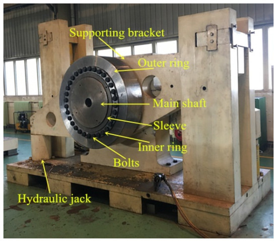 Based on the design theory of this work, a MW-level turbine shrink disk was designed to verify the reasonability of the proposed theoretical model and finite element model, and the parameters are given in Table 2. A test device was developed for performance test, as shown in Figure 4. The test gradually applies torque to the turbine shrink disk by hydraulic jack and supporting bracket. In the performance test of the shrink disk, the holding pressure time is set as three minutes based on test experience. The circumferential slip between the contact surfaces is monitored using the method of fixed reference line, the slip of all contact surfaces is zero, which shows this design size can transfer the applied torque and can meet the requirements of the given working conditions; the specific data is given in Table 3. The rated torque of shaft transmission is T0 = 2800 kN·m, as shown in Table 2.