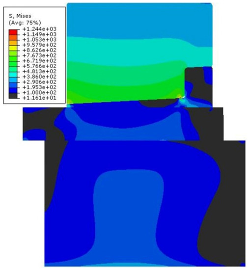 Through the above-described modeling method, models with different assembly clearance, machining deviation, and propel stroke were compared with the ideal model, and the influences of each factor on the contact pressure of the mating surfaces were analyzed. The contact pressure is generated between each of the mating surfaces during assembly, which directly affects the working performance of the mating surfaces [16]. Figure 5 gives the distribution of the Von Mises stress of the turbine shrink disk using the ideal model [17].