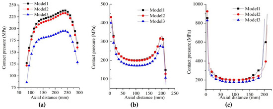 The machining deviation will directly affect the interference magnitude. From Equation (7), we know that contact pressure P3 is proportional to the interference magnitude. From Equations (7) and (8), we can deduce that contact pressures P1 and P2 are proportional to contact pressure P3 when the assembly clearance is certain, and contact pressures P1 and P2 are proportional to the magnitude of interference . Thus, the machining deviation will affect contact pressures P1 and P2. Model 1, Model 4 and Model 5, with the same assembly clearance stated in Table 1, are used to study the effect of machining deviation. Model 4 and Model 5 have the minimum and maximum interference magnitudes, respectively, which result from machining deviation on the mating surfaces of the inner ring and the outer ring.