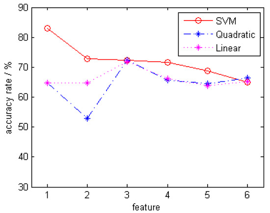 After median filtering, support vector machine, linear discriminant analysis [27], and quadratic discriminant analysis [28] were used to build models using each feature separately. In practice, 10-fold cross-validation is widely used to test the accuracy of algorithms [17,29], which meant the entire data set was divided into 10 equal parts, nine parts were taken as training sets and the remaining one was used as a test set. Experiments were conducted ten times, and the average result was taken as the accuracy rate of the model. The results are shown in Table 3 and Figure 7, where the features were sorted in descending order according to the accuracy rate of SVM.