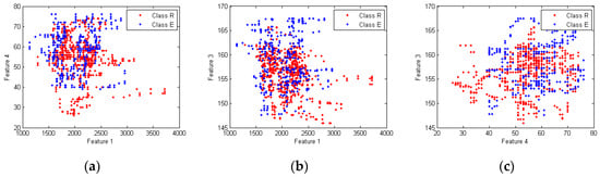 Scatter plots of selected features: (a) Feature 4 vs. Feature 1; (b) Feature 3 vs. Feature 1; (c) Feature 3 vs. Feature 4.