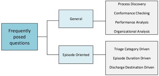 In addition to conducting an analysis led by each of the categories separately, they can be combined to obtain more specific and in-depth results, according to the requirements of the frequently-posed question. For example, those that attempt to describe the process (process discovery) that relate to red or orange category episodes (triage-driven questions) or those that require verification regarding whether they comply with existing regulations or protocols (conformance checking) in long-stay episodes (stay duration oriented questions). As the level of specificity of the question increases, the required level of combination between the categories also increases in order to produce the correct answer. Understanding the frequently-posed questions and their categories can help to produce both a data extraction guide and a methodology for the application of data and process analysis.