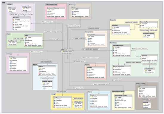 Data reference models are common across a wide range of areas []. For example, in [,], the authors propose a general model for HC. However, a model for ER has not yet been proposed. The ER model proposed in this section, as shown in Figure 2, extends the aforementioned HC model, including specific dimensions of ER, such as consultation rooms (boxes) or triage, obtained from the analysis of previous ER case studies and information provided by ER experts. The data model proposed for ER is a model that specifies the data structures and their relationships for representing ER episodes. The data types included in the proposed data reference model were defined or identified from the original HC model and from the HIS studied during the case study. The model does not aim to fit any specific system, but rather to provide a framework that represents, in a generic manner, the data extracted from any ER system.