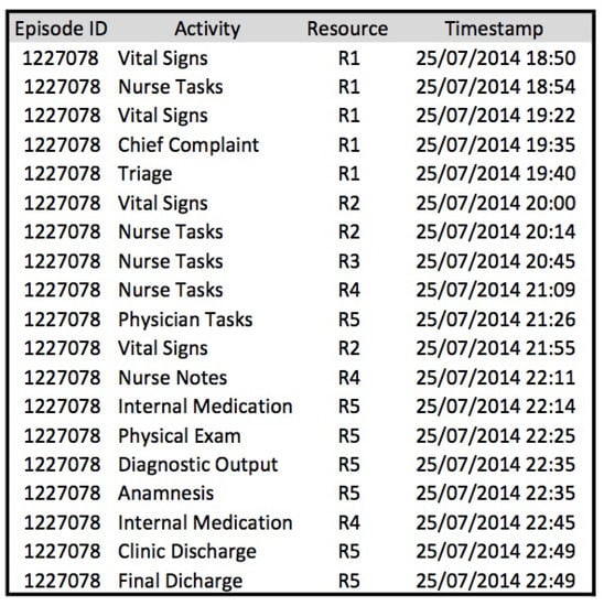 Previously, data from ER have been used to conduct three case studies that involve the application of process mining [,,]. The case studies have provided information regarding the flow of executed activities (e.g., triage and examinations carried out), the relationships between available resources and the identification of opportunities to reduce waiting times for treatment.