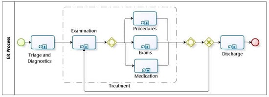 One way of resolving this problem is to identify the activities and classify them into subprocesses, in conjunction with the ER expert. Accordingly, three important subprocesses were identified. First is the subprocess that contains the triage and diagnosis activities corresponding to the tasks in which the seriousness of the condition of the patient is determined. Second is the subprocess that contains activities relating to treatment, which includes four subtypes grouped into their own subprocesses, as follows: the patient’s physical examination subprocess; the procedure execution subprocess; the subprocess of taking exams; and the medication administration subprocess. Third is the subprocess that includes the activities associated with clinical discharge. The subprocesses are shown in Figure 7 in a diagram constructed in BPMN, where it can be seen that the initial subprocess is the triage and diagnostics. Subsequently, the process continues with the physical examination, procedure execution, taking exams and medication, in a loop that can take place more than once, and finally, the discharge subprocess is undertaken. Before executing the discharge subprocess, the condition of the patient must be checked; if the patient is ready to be discharged, the episode continues with this subprocess; otherwise, more procedures and exams should be performed.