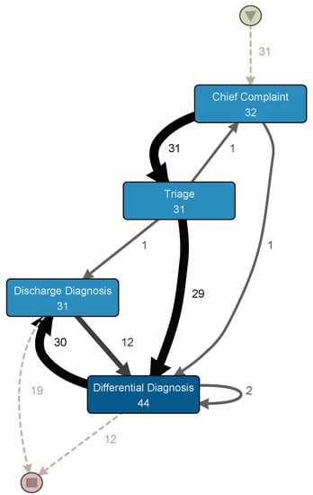 Owing to medical importance, analysis will only focus on diagnosis and treatment (including the four subprocesses therein). Regarding the activities of the triage and diagnostics subprocess, the activities were filtered and the process model generated in Disco, as shown in Figure 8. Two significant activities were identified in 31 of the cases (90%) and which have a very clear order at the beginning of each episode. First, the chief complaints/entry notes activity was undertaken, followed by the triage.