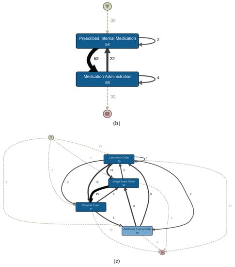 The remaining models relate to the subprocesses of performing medical procedures (see Figure 10a), taking exams (see Figure 10b) and medication (see Figure 10c), which can be undertaken simultaneously, according to the patient diagnosis. The treatment subprocesses (procedures, exams and medication) can be executed one or more times in a continuous manner, alternating between different subprocess activities. The models obtained with the Disco tool help to clarify the details of how activities are performed on each particular subprocess. Based on the obtained models, evaluation by the ER experts can then be performed.